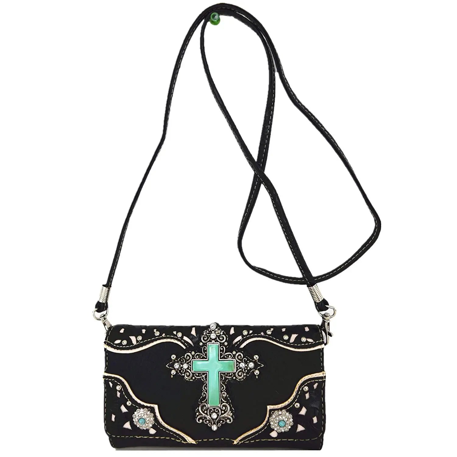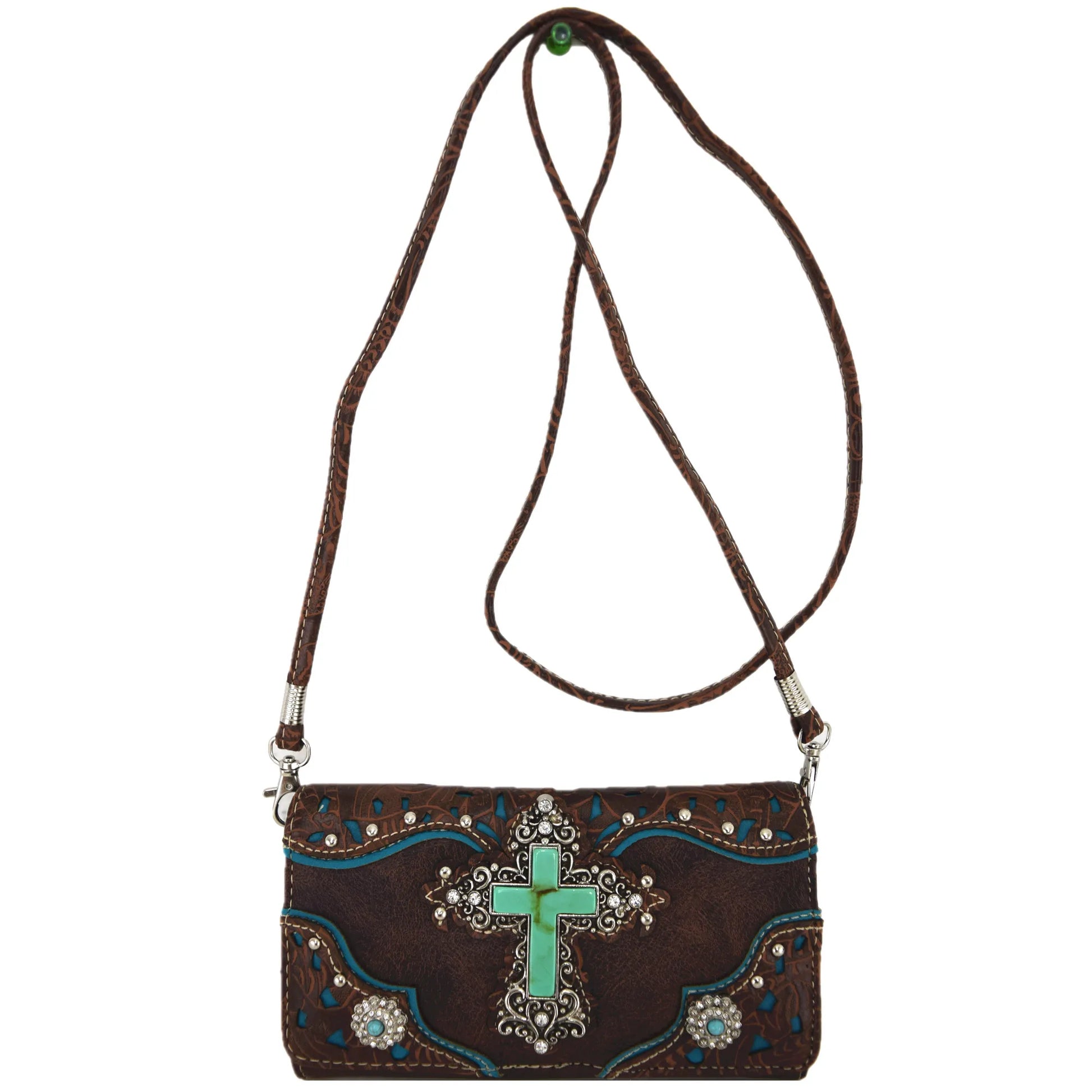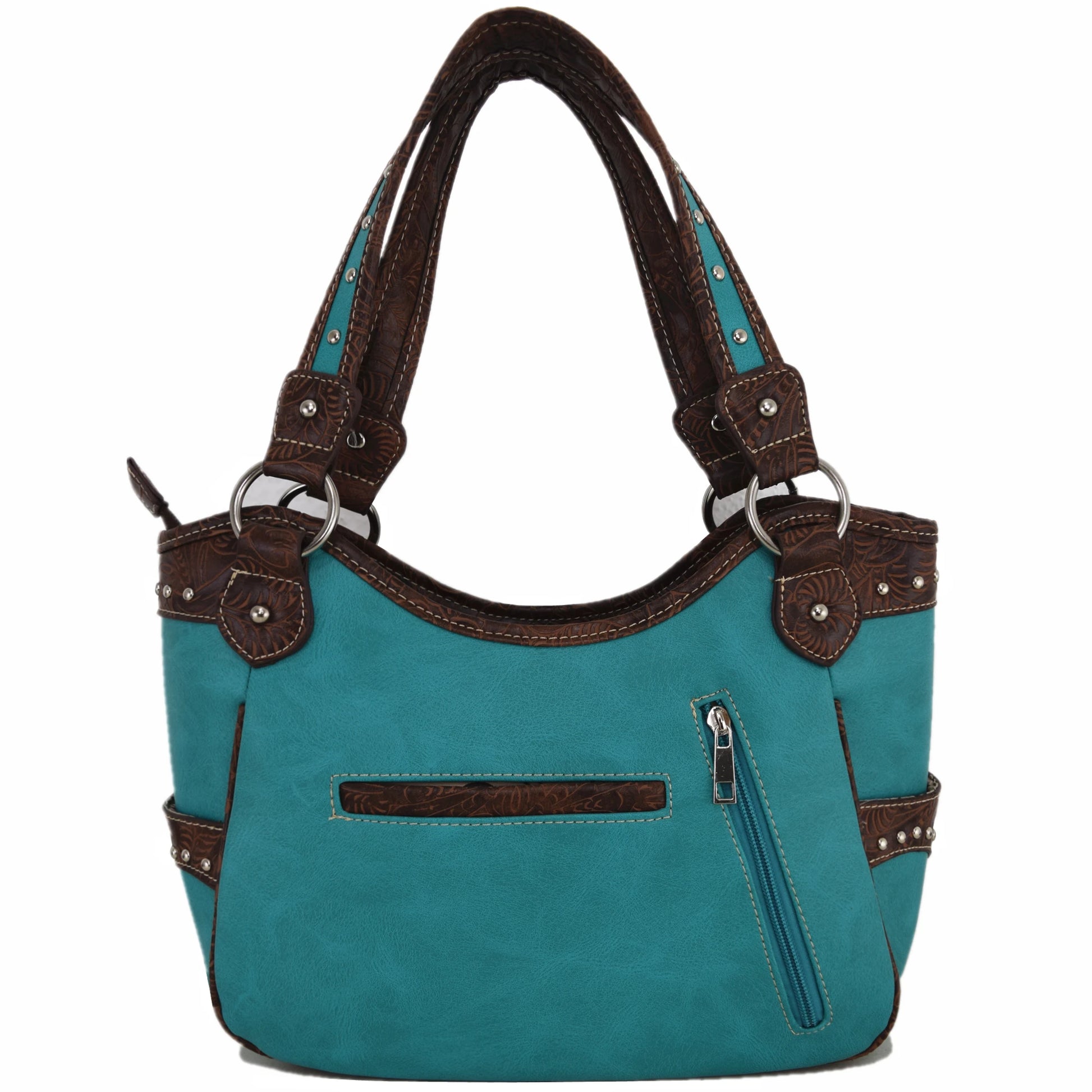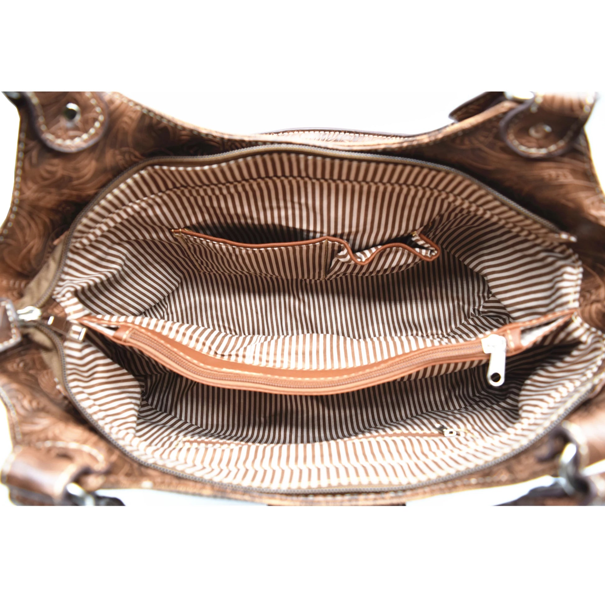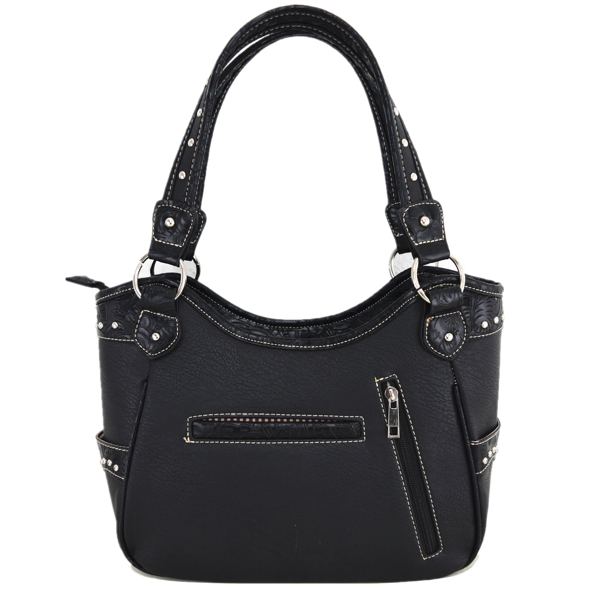 Western Style Tooled Leather Studded Handbag and Matching Trifold Wallet W/ Cross